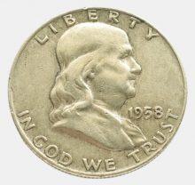 United States half dollar 1958. Franklin Half Dollar. XF+