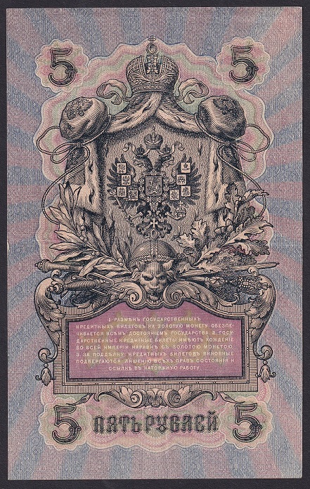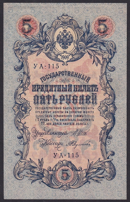 Russia 5 roubles 1909. (Series У. A). XF. P-10b(1)