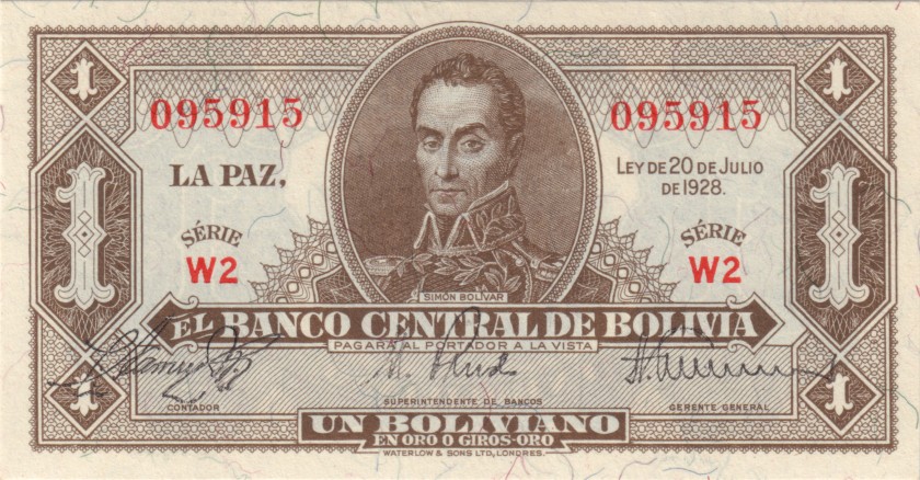 Bolivia 1 boliviano 1928. (Serie W2). UNC. P-128a(2-1)